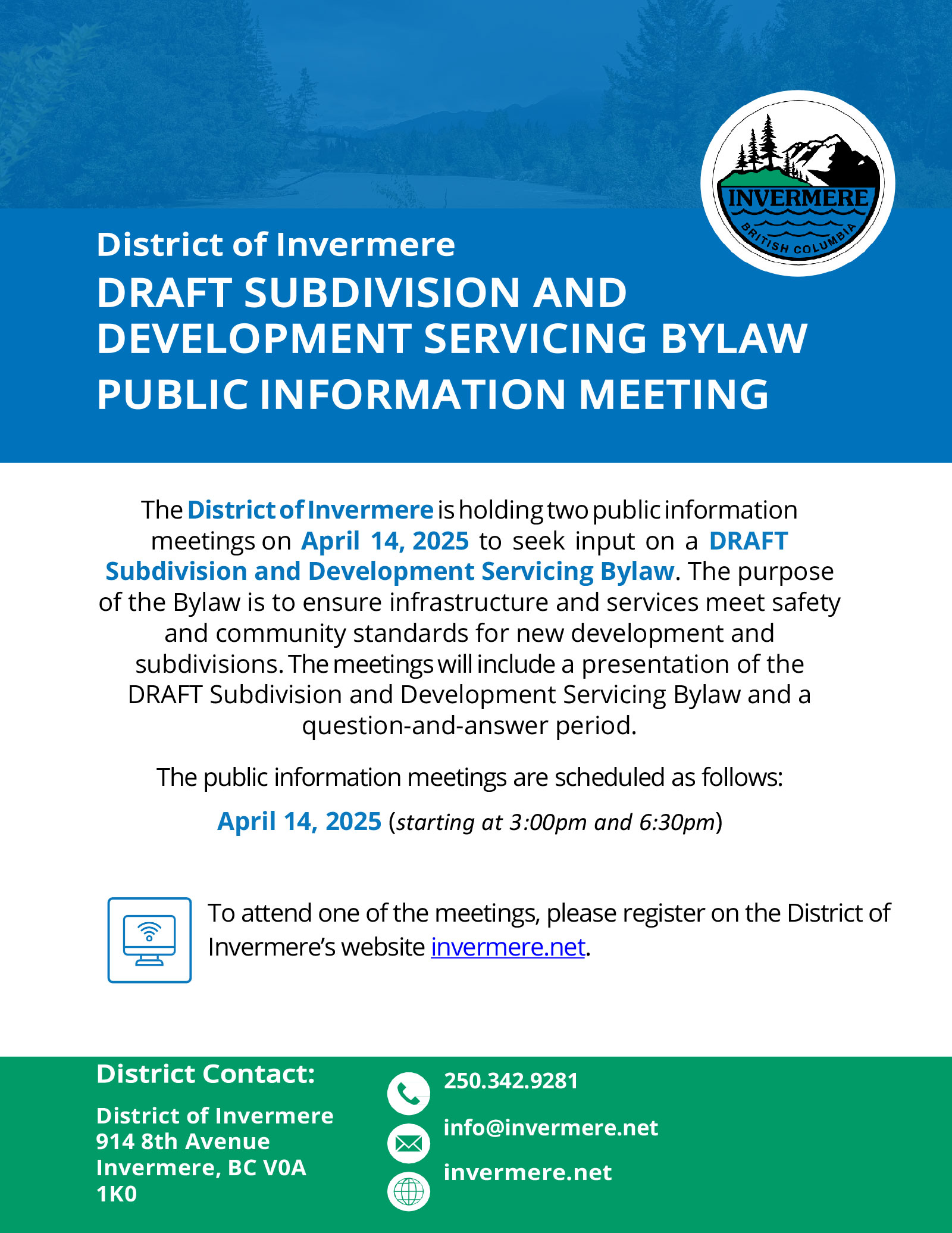 The District of Invermere is updating the Subdivision and Servicing (SDS) Bylaw to align with the Master Municipal Construction Documents (MMCD), incorporate climate considerations, and reflect current legislation. This update aims to provide clearer guidance on the roles and responsibilities of both developers and the municipality and ensure consistency with standardized construction specifications across British Columbia.