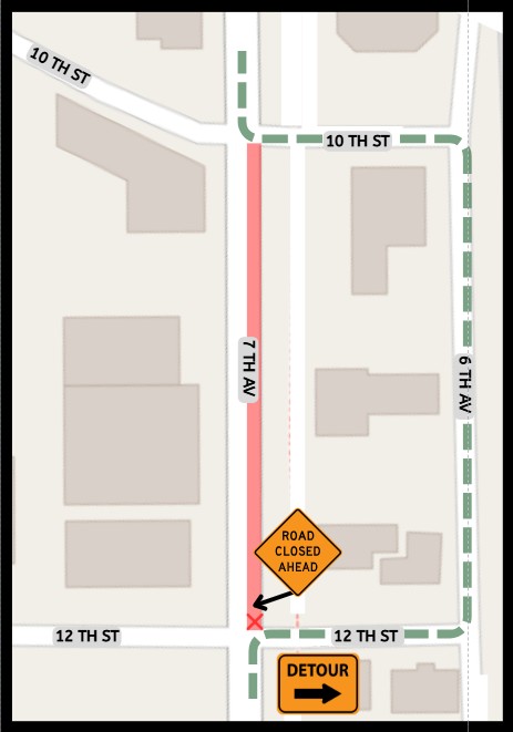 Northbound traffic will be redirected onto 2nd Street via 6th Avenue, then onto 12th Street to rejoin 7th Avenue.